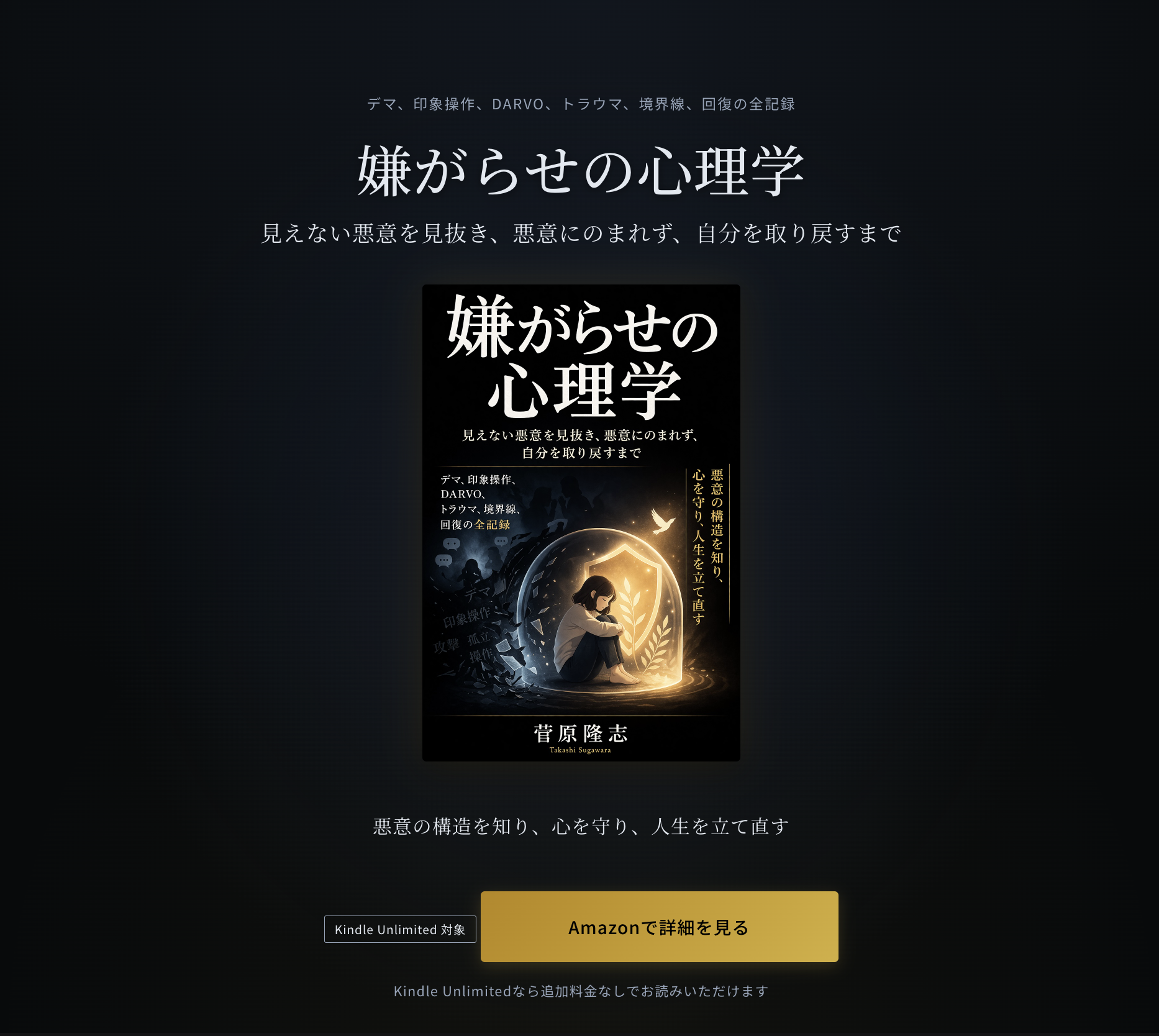 嫌がらせの心理学 | 見えない悪意を見抜き、悪意にのまれず、自分を取り戻すまで デマ、印象操作、DARVO、トラウマ、境界線、回復の全記録 嫌がらせの心理学 見えない悪意を見抜き、悪意にのまれず、自分を取り戻すまで 悪意の構造を知り、心を守り、人生... -