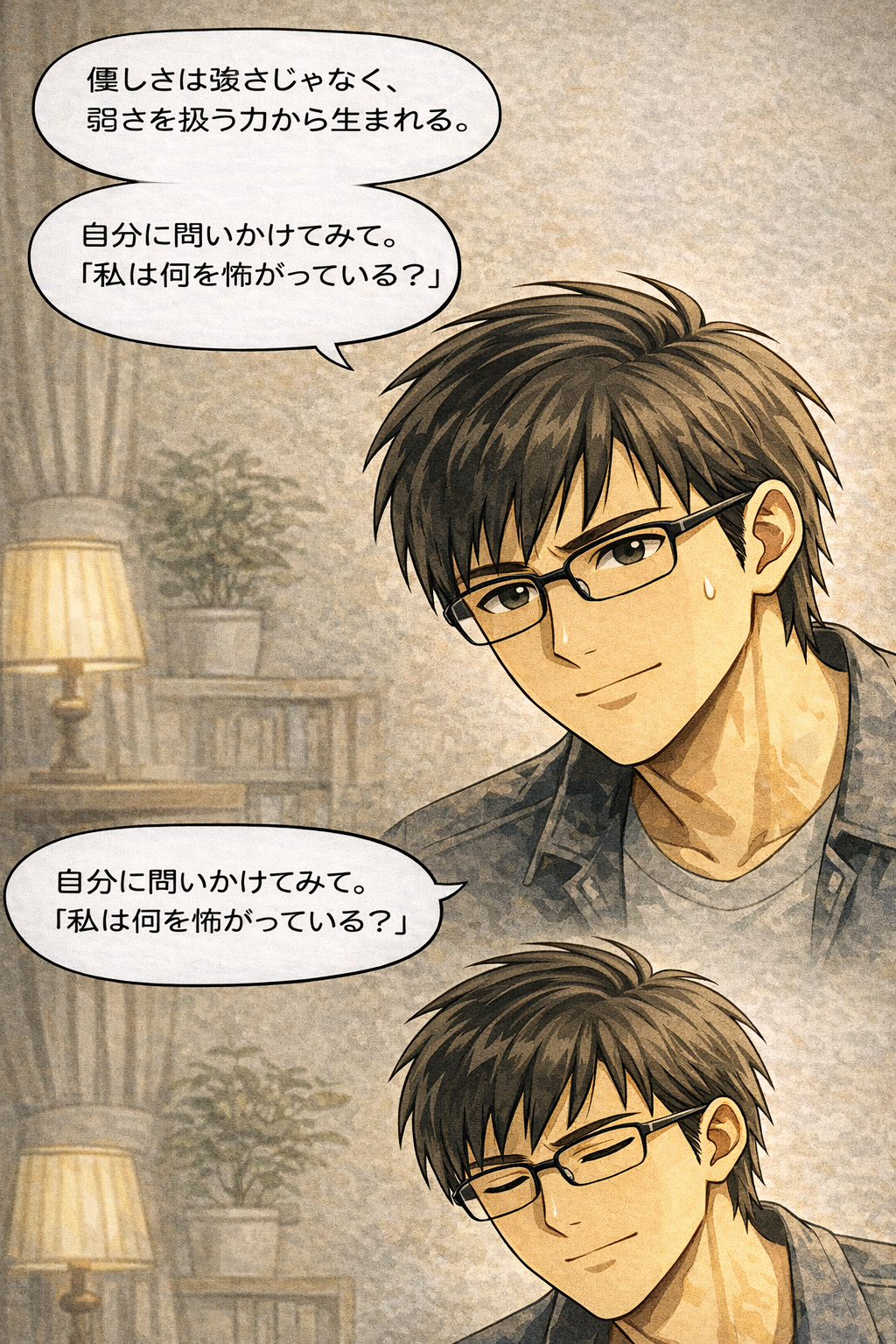 弱さを受け入れることで優しさが戻り、読者へ向けて自分の弱さを問いかけるメッセージで締めくくる。