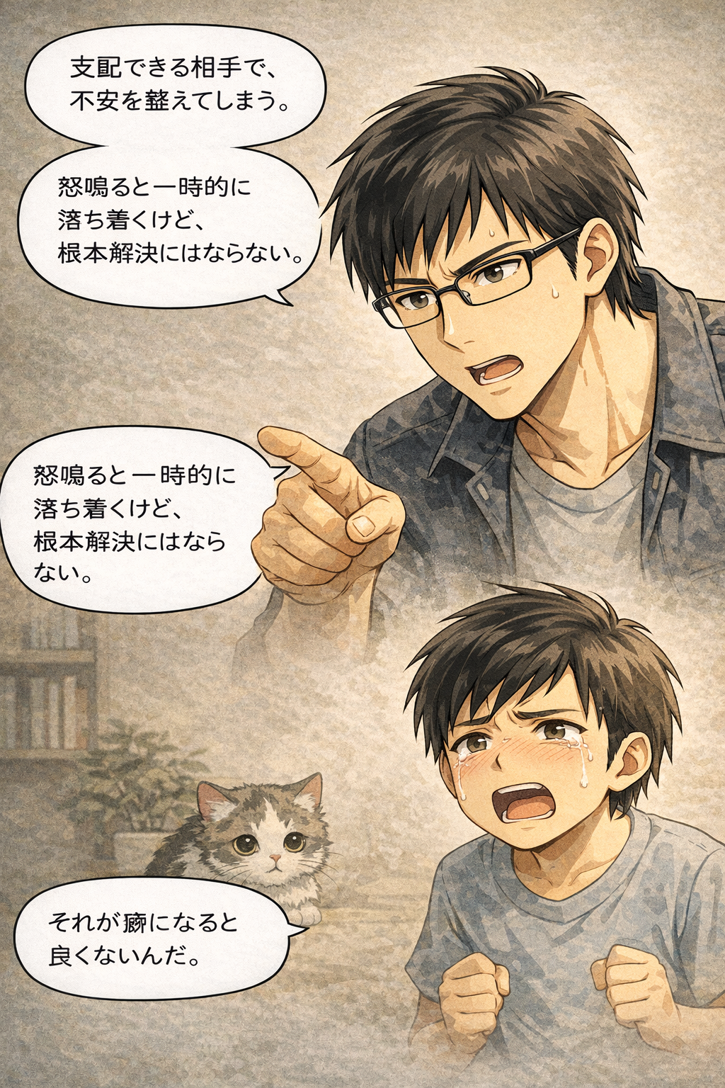 子どもや動物を支配することで、自分の不安を一時的に鎮めてしまう心理を描写。