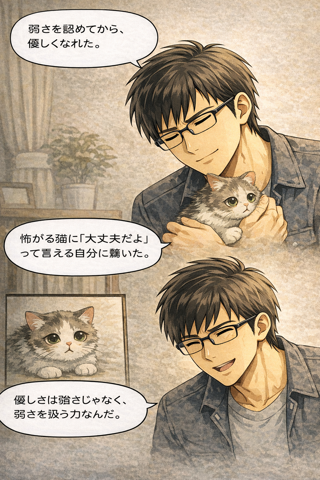 弱さを認めてから猫や子どもに優しくなれた変化と、その感動を描写。