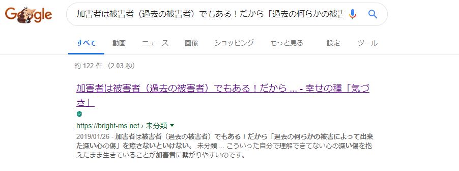 「加害者は被害者(過去の被害者)でもある!だから「過去の何らかの被害によって出来た深い心の傷」を癒さないといけない。 | 幸せの種「気づき」のグーグル検索結果」を見て頂ければわかりますが、この文章を丸々コピーして検索すれば「僕のブログ以外に存在しない文章(ツイッターにはツイートしてあるからそれを除き)」だという事実がわかります。