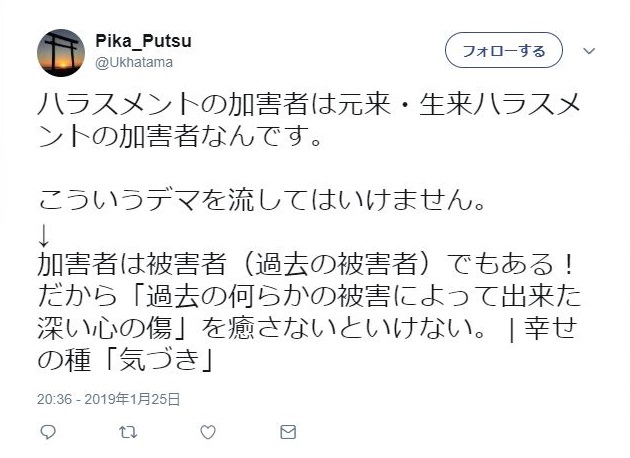 上記の「加害者は被害者(過去の被害者)でもある!だから「過去の何らかの被害によって出来た深い心の傷」を癒さないといけない。 | 幸せの種「気づき」」という文章。これは僕が書いた文章です。1文字の狂いもなく。そしてこれは「デマ」ではなく「僕個人の意見」です。他人の意見をデマにすり替えてデマ扱いし不特定多数の人間に晒す、これが問題です。