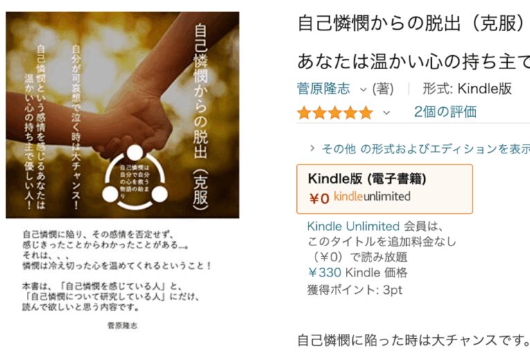 自己憐憫(じこれんびん)にも良いところがあると知って欲しいと思って出版したのですが、この本に、また高評価(星五つ)がつきました! ということは、読んでくれた人のプラスになったということだと思いますので、とても嬉しく思います。評価してくれた方、ありがとうございます。