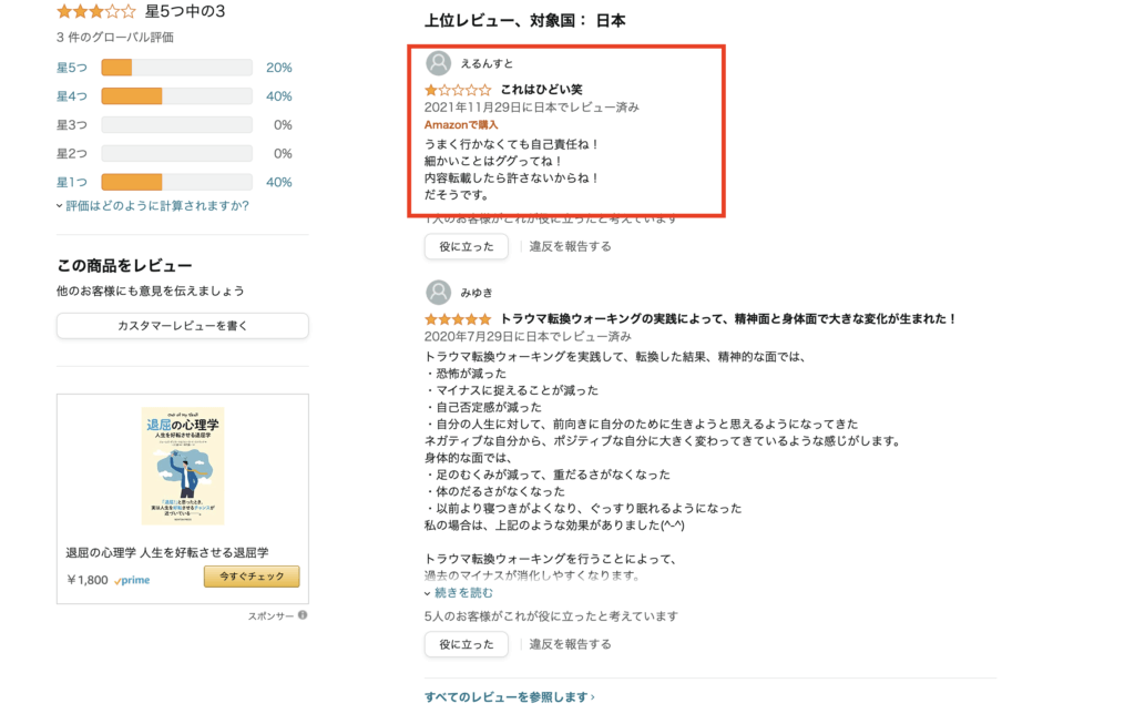 神奈川県のとある心理士(左派軍団)のトラウマに関する意見に否定的な(健全な意味での)記事を書いた後、パートナーが「トラウマ関連のレビューに嫌がらせしてくるんじゃない?」と言っていた後(記事を書いて数日後)に、これが書かれていました。この者(左派心理士)かどうか確実なことはわかりませんので、それはとりあえず置いといて・・・。