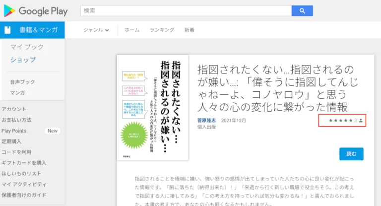Google Playで無料公開している電子書籍「指図されたくない…指図されるのが嫌い…」 にまた高評価が掲載されました! 高評価をつけてくれた人たちはすごいですね!自分の力でそこ(文章)にある情報を材料にして何かを得たのですから。読書というのは、自分の内側にある自分の良さを自分の力で引き出す作業 なのです。