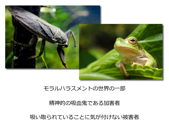モラルハラスメントの世界の一部とは「タガメ」と「カエル」のようなものです。 これは決して馬鹿にしているわけではありません。モラルハラスメントの仕組みを説明するのに「タガメ」と「カエル」がしっくりくるためです。
