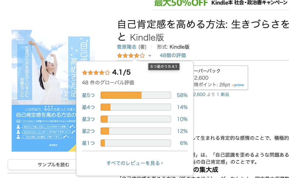 また星5つの高評価が掲載されて、自己肯定感を高める方法(書籍)の評価数が合計48個になりました!