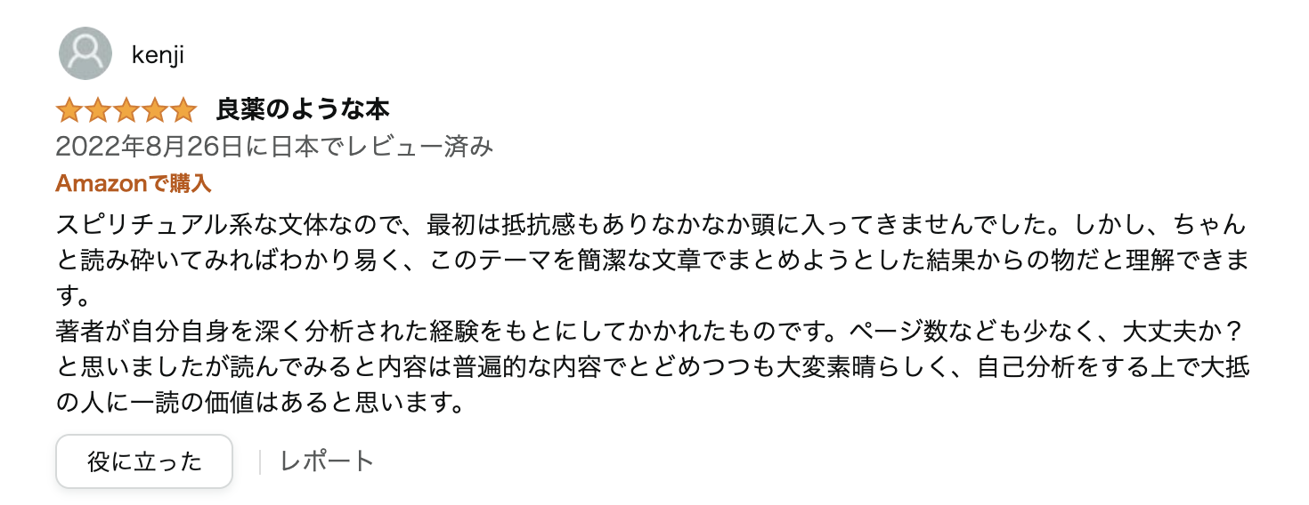 レビュアーの一人であるkenjiさんは、この本を「良薬のような本」と評価しました。初めて読んだ時は、本のスピリチュアルな文体に少々抵抗感を感じ、理解するのに苦労したと言います。しかし、彼は一生懸命にその内容を読み解き、その結果、本のテーマが簡潔な文章にまとまっていることを理解しました。