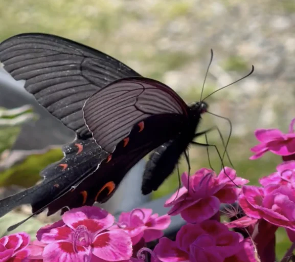 正直言うと、僕はダイアンサスを「ばばくさい花だな」と思っていました。だけどクロアゲハが寄ってきているのを見て、見方が変わりました。下記の画像を見てください。こんな近くに寄っても逃げないし、見た目もかっこいいアゲハ蝶なので写真を撮ってみました。